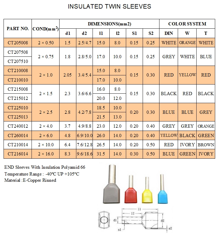 .SOLDERLESS INSULATED PIN TERMINALS,WITH COPPER SLEEVE(PVC)